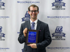 JEFFERSON THOMAS, Houston, received the Campus Service Award during Missouri State University-West Plains’ annual Celebration of Leaders student awards ceremony April 29 at the West Plains Civic Center. The award recognizes students who make the greatest contribution to campus efforts by volunteering their time to serve significant campus interests that improve the quality of life and uphold values consistent with the betterment of campus life. (Missouri State-West Plains photo)