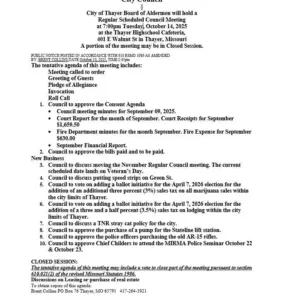 The Monthly meeting of the Thayer City Council on Tuesday, October 14th, will be held in the Thayer High School Cafeteria due to the remodeling of the council room. The meeting starts at 7 pm. The Agenda is available here.