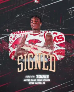 FAYETTEVILLE – The two-time Connecticut Player of the Year and top 30 player in the country, Abdou Toure, a 6-5 wing from West Haven, Connecticut, signed with the Arkansas Razorbacks on Wednesday. Toure is the 12th highest-ranked prospect by ESPN that Arkansas has signed. Named the 2024-25 Connecticut Gatorade Player of the Year after averaging 25.1 points per game as a junior