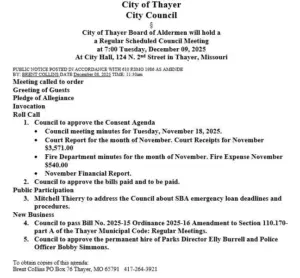 The Thayer City Council meets tonight at City Hall for the regular monthly meeting. The meeting begins at 7 pm, and everyone is welcome.